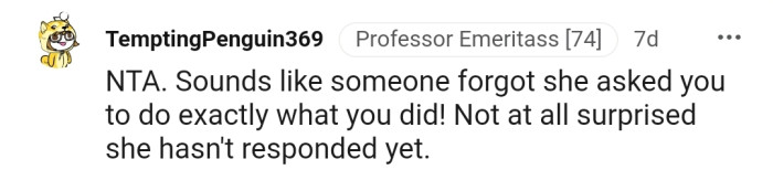 "Sounds like someone forgot she asked you to do exactly what you did!"