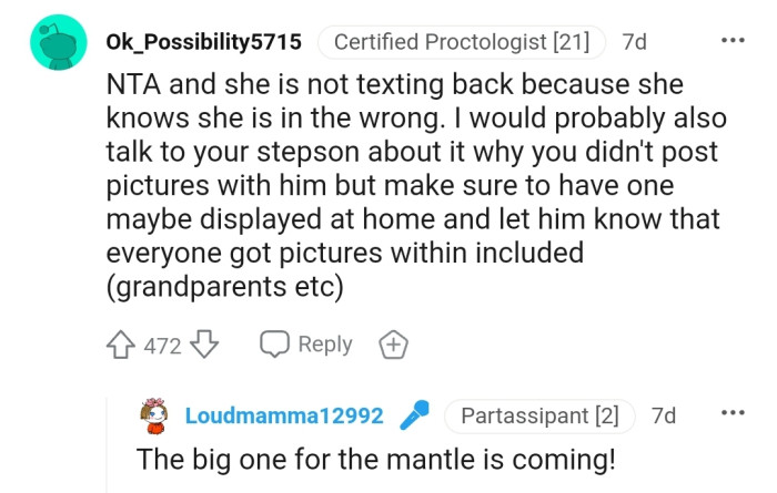 The commenters believe OP has no fault in this matter. They didn’t feel the same way about her stepson’s mother, however.