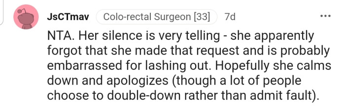 "Her silence is very telling - she apparently forgot that she made that request and is probably embarrassed for lashing out"
