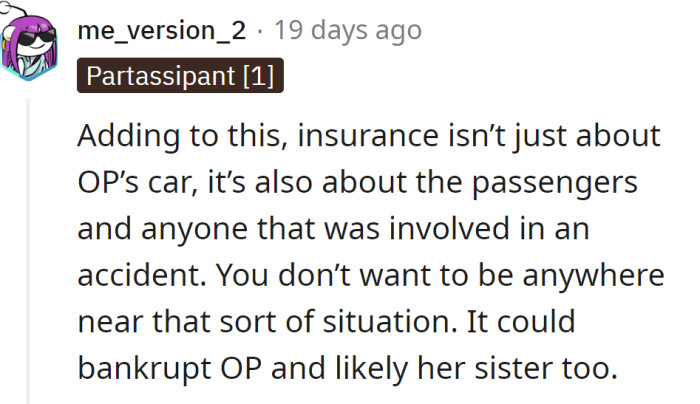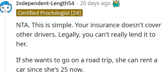 However, a dilemma has arisen involving her sister, who is eager to borrow the car for an upcoming road trip with her friends. Unfortunately, the OP's sister has a history of being irresponsible with borrowed items.