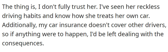 RedditBut when her sister asked to borrow it for a road trip, the OP explained why she didn't think it was a good idea: