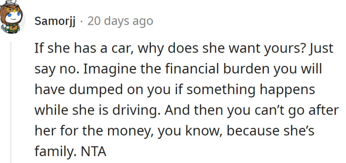 Redditor Finally Saves Money And Buys Nice Car, Family Pressures Her To Lend It To Her Sister For A Road Trip
