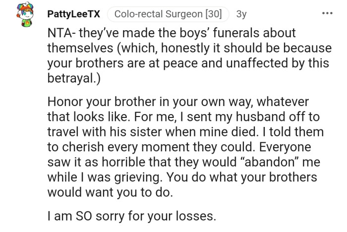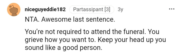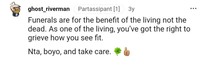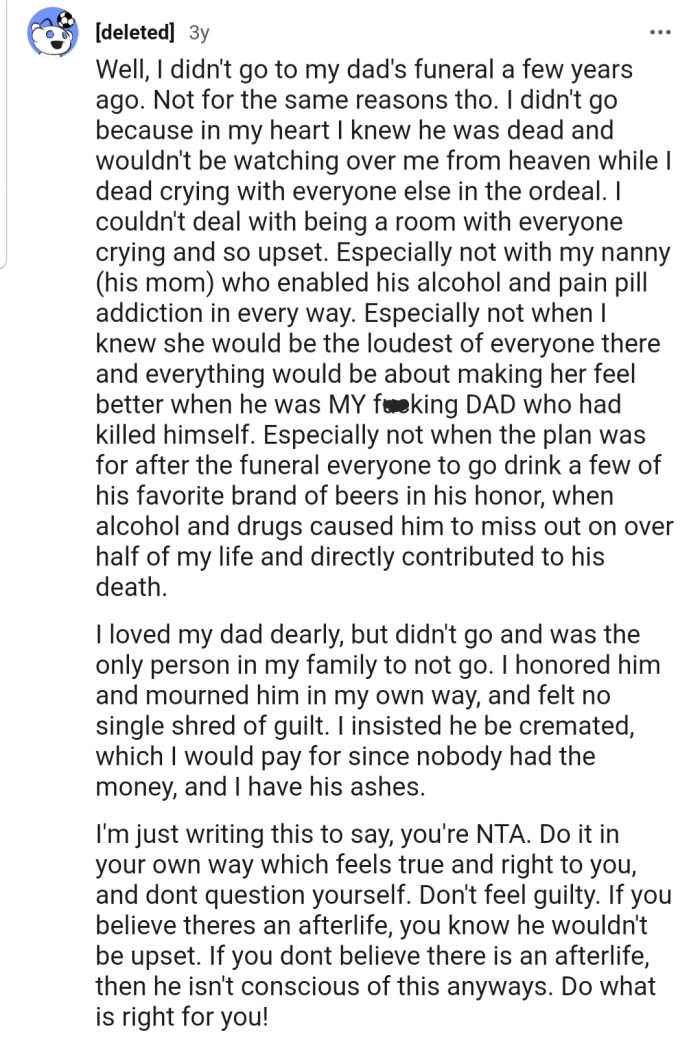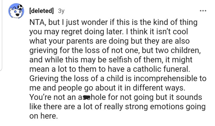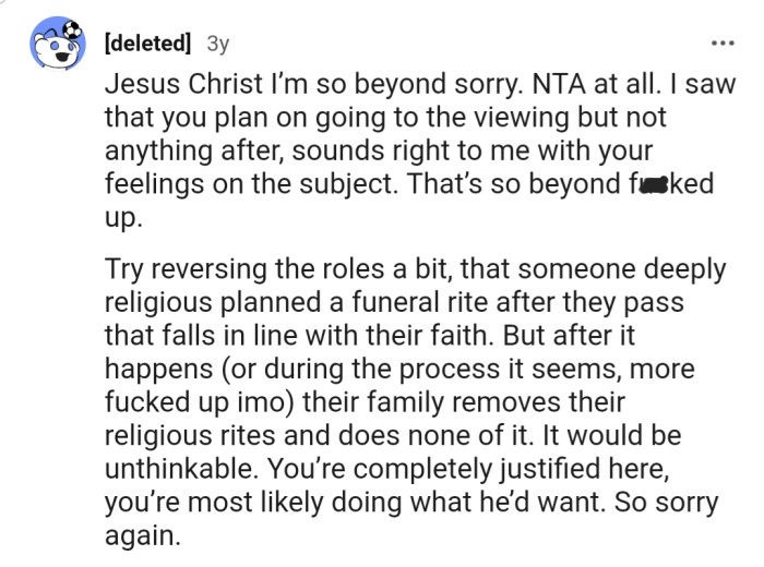To OP’s dismay, their family decided to also make his funeral a Catholic one, despite him being an atheist like his late twin. At this point, OP decided they couldn't take it anymore—they decided to stay back from the funeral and grieve in their own way.