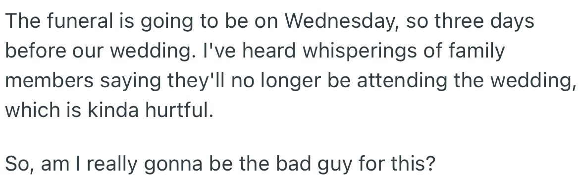 The funeral was set a mere three days before the wedding, and rumors of boycotting her celebration began to swirl among relatives. Hurtful? Absolutely.