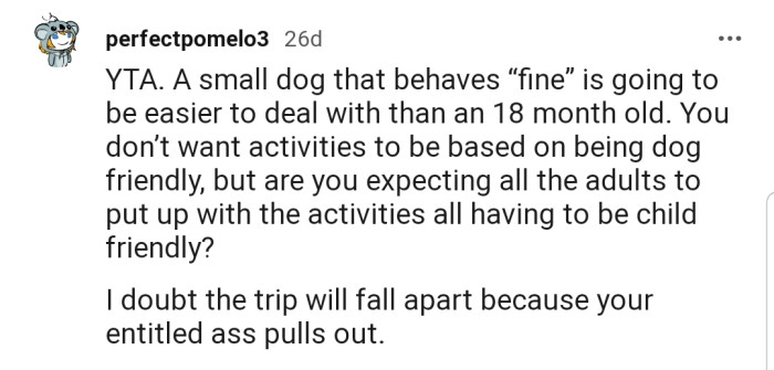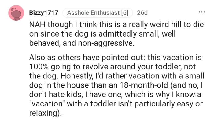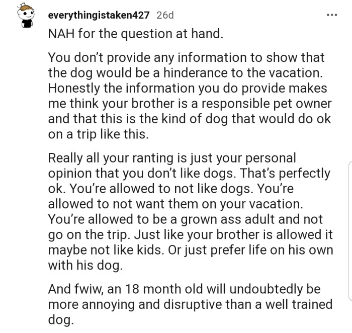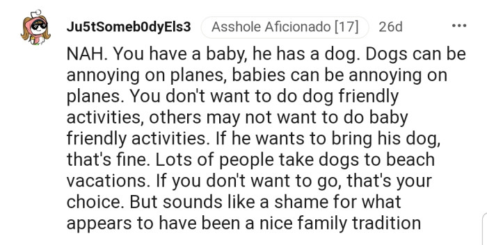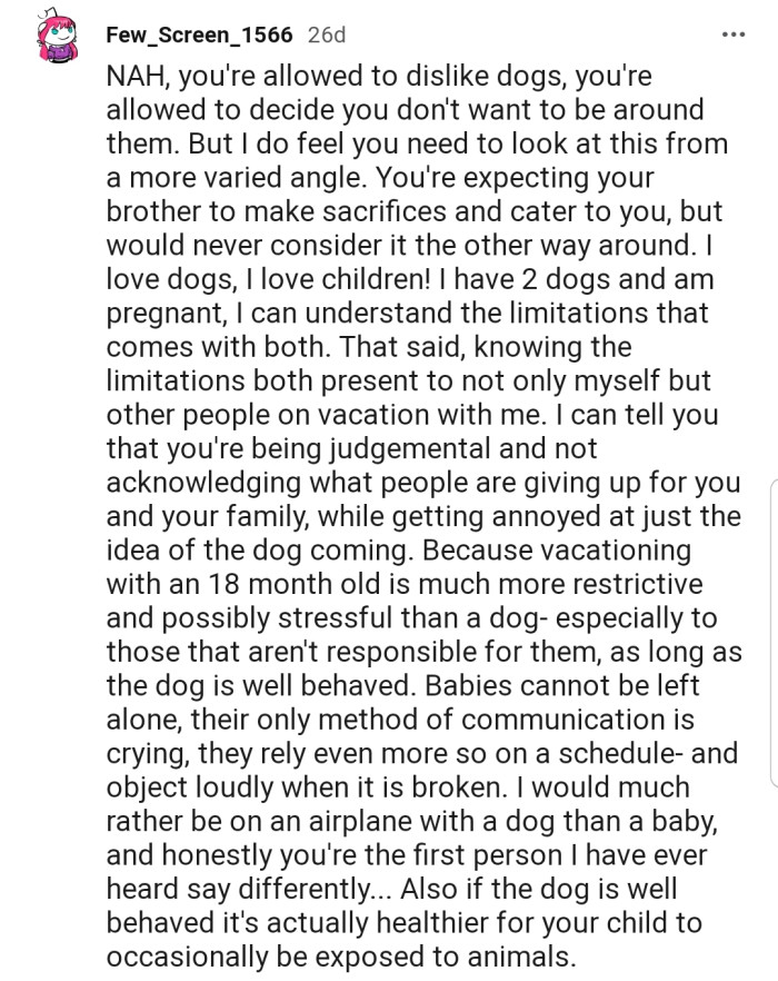 However, OP had one problem: his brother planned to bring his dog to the beach house. For OP, this was an issue because he dislikes dogs and doesn’t want one around his 18-month-old.
