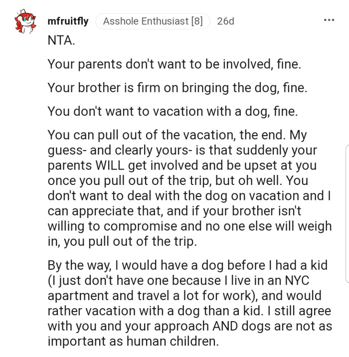 "You don't want to deal with the dog on vacation, and I can appreciate that. If your brother isn't willing to compromise and no one else will weigh in, you should pull out of the trip."