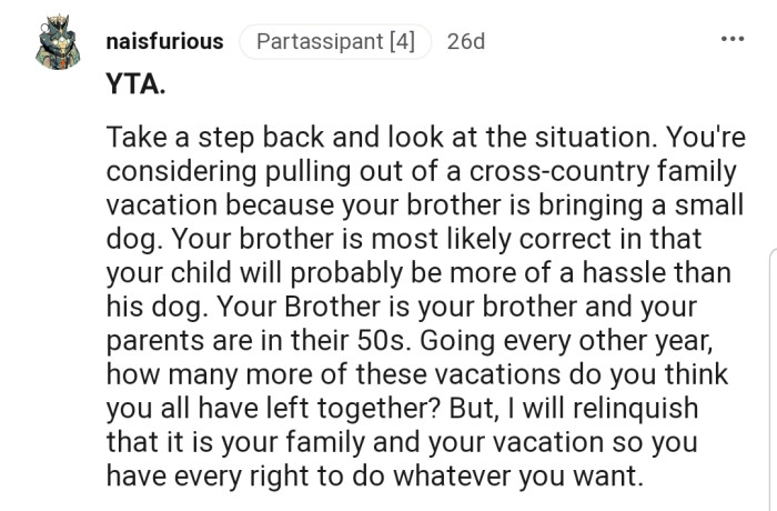Join the conversation! What do you think about OP's reaction to his brother bringing a dog to their family vacation?