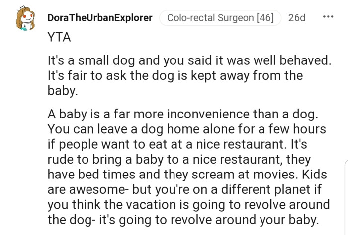 "It's a small dog, and you said it was well-behaved. It's fair to ask that the dog be kept away from the baby."
