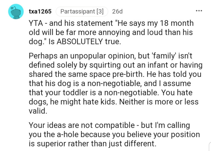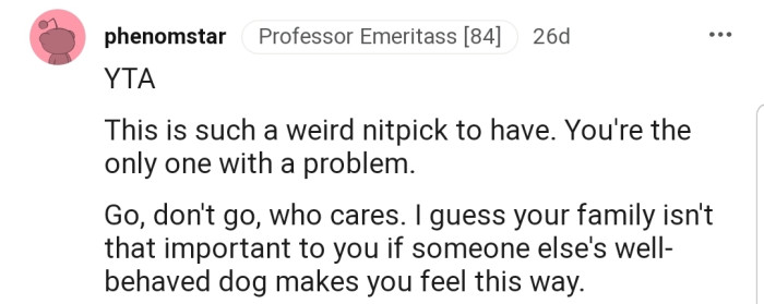 "I guess your family isn't that important to you if someone else's well-behaved dog makes you feel this way."