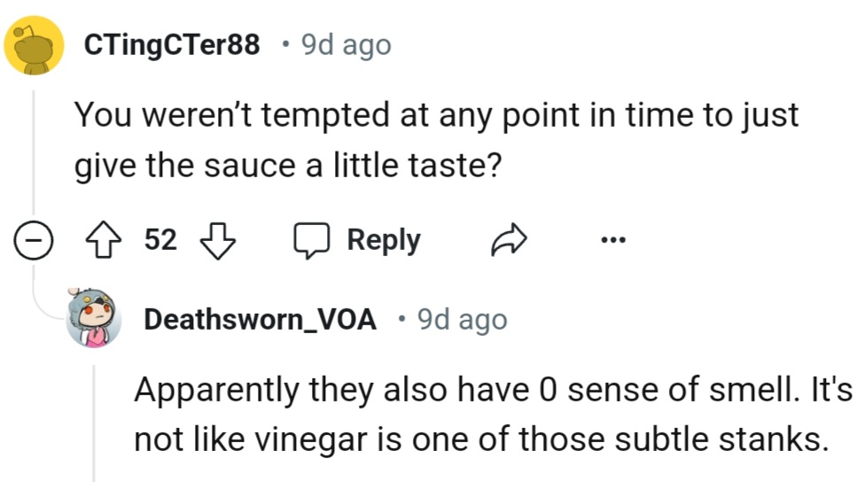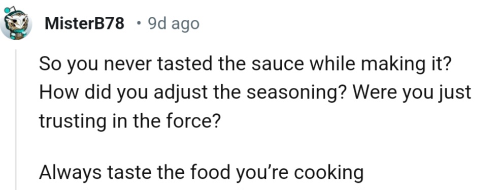 OP plated everything up, feeling like they’d just nailed a Gordon Ramsay-level dish. Their boyfriend sat down, took one bite, then his face contorted into a vision of disgust. He asked, with the utmost politeness, “Is the sauce supposed to taste like this?”