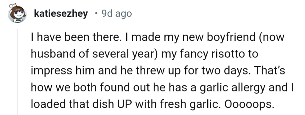 "I made my new boyfriend (now husband of several years) my fancy risotto to impress him, and he threw up for two days"