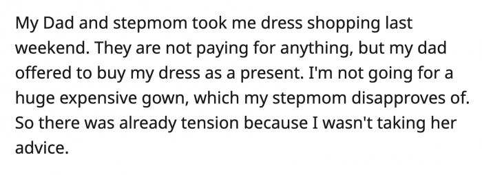 As a present, OP's dad and her stepmom took OP wedding dress shopping. OP chose a simple gown, which her stepmom disapproved of.