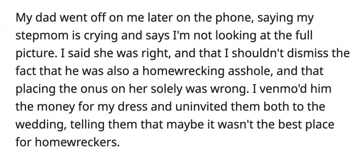 OP agreed and said she shouldn't have overlooked that he was also a cheating a**hole. OP Venmo-ed her dad the money for her wedding dress and uninvited them to her wedding, saying it's not the best place for homewreckers.