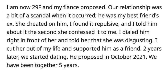 OP's fiancé used to be her best friend's boyfriend. The ex-best friend cheated on him, and when OP found out, she called him in front of her best friend and told her she was disgusting.