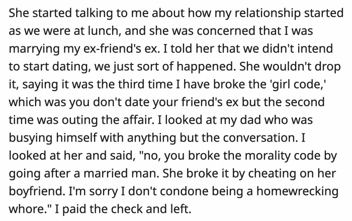 Her dad was busying himself with other things and pretending he couldn't hear. OP looked at her stepmom and said, "No, you broke the morality code by going after a married man. She broke it by cheating on her boyfriend. I'm sorry, but I don't condone being a homewrecking whore."