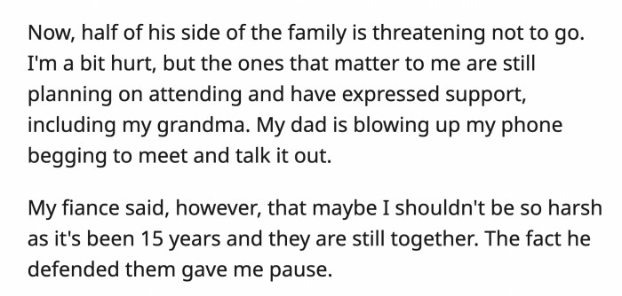 Her dad's side of the family heard about the problem, and most of them are threatening not to attend the wedding. OP is hurt, but her grandma and those who matter to her are still attending.