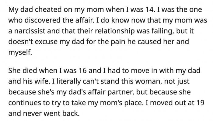 Her mom died when OP was 16, and she was forced to move into her dad's house, who at this point was married to his affair partner. OP obviously hates her father's new wife because of the cheating and because she has been trying to position herself as OP's new mom.