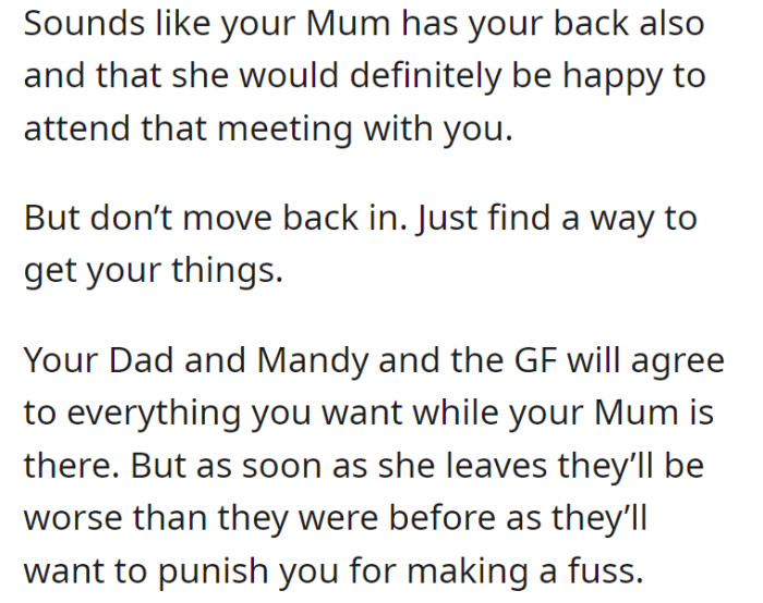 Redditors advised the OP to bring her mother with her when going to collect her things from her dad's house. They told her she was not in the wrong for feeling neglected and overshadowed by her dad's girlfriend and her daughter because he allowed them to do so.