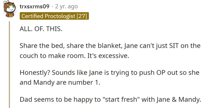 Even though the OP is required to share her things, including a cherished blanket gifted by her mom, the same expectation does not apply to Mandy. On one occasion, Mandy attempted to take one of the OP's beloved books after an argument between Jane and her dad.