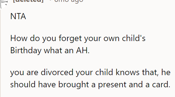 When the son confronted him about forgetting his birthday, it led to a significant argument over the phone between the exes. The ex criticized the OP for not helping him by putting his name on a birthday card or reminding him of the date.