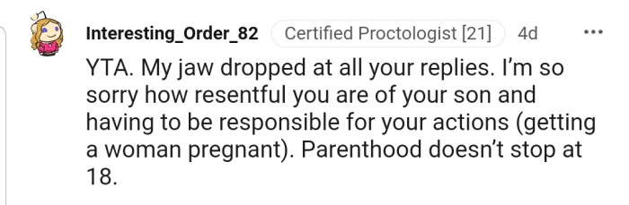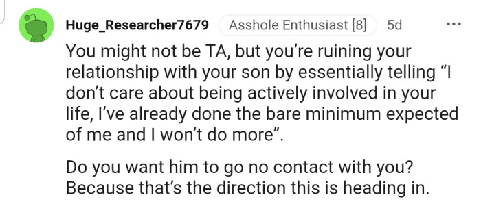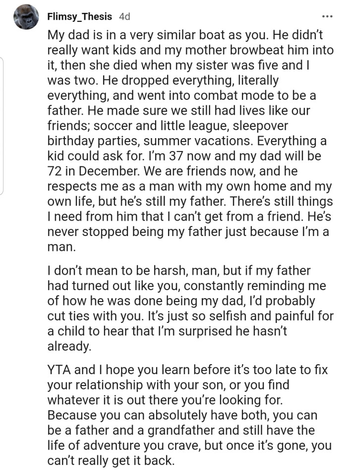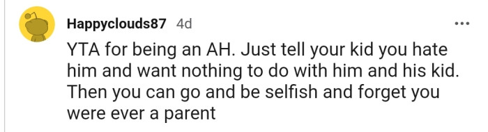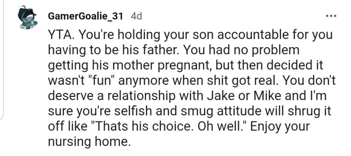 OP has been declared the ultimate a**hole in this story. The commenters have accused him of being a terrible father for even mentioning to his son that he has retired from parenting.