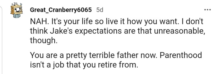 Reflecting on his own journey, OP candidly advised Jake on the challenges and responsibilities of parenting. He also informed Jake that he had retired from active parenting and would prefer to focus on enjoying life to the fullest.