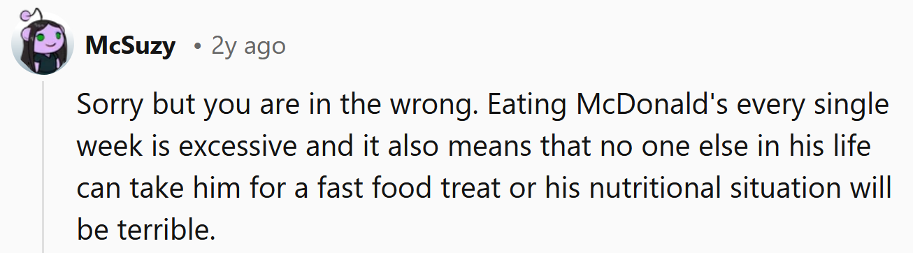 When the Redditor's ex found out, she asked him not to take their son to McDonald's every week because she wanted him to eat healthy food.