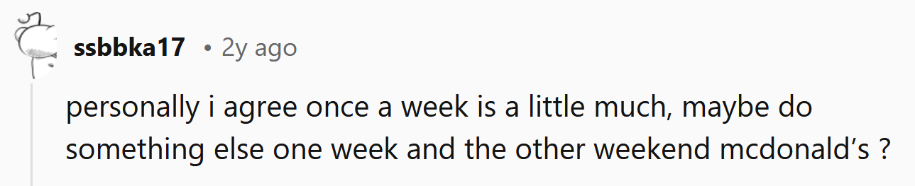 When the Redditor's ex found out, she asked him not to take their son to McDonald's every week because she wanted him to eat healthy food. However, the OP disagreed because it's something their son really looks forward to each weekend.