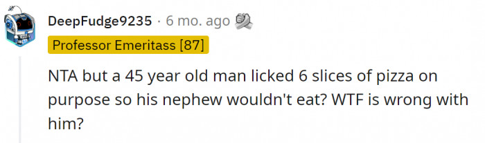 "A 45-year-old man licked 6 slices of pizza on purpose so his nephew wouldn't eat?"