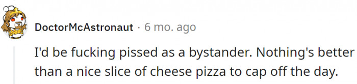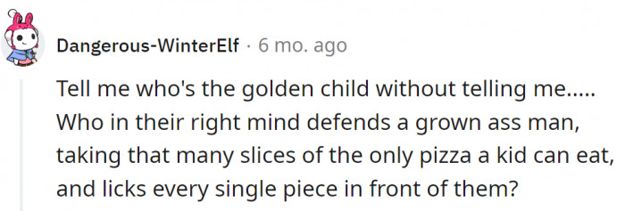 "Who in their right mind defends a grown-ass man, taking that many slices of the only pizza a kid can eat, and licks every single piece in front of them?"