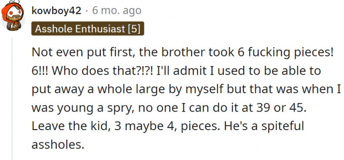 "Not even put first, the brother took 6 fucking pieces! 6!!! Who does that?!"