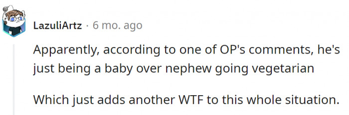 "According to one of OP's comments, he's just being a baby over his nephew going vegetarian."