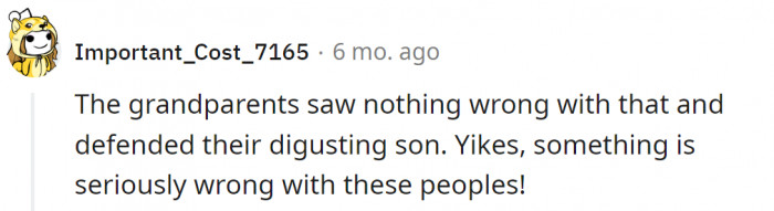 "The grandparents saw nothing wrong with that and defended their disgusting son. Yikes!"
