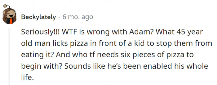 "Seriously!!! WTF is wrong with Adam? What 45-year-old man licks pizza in front of a kid to stop them from eating it?"