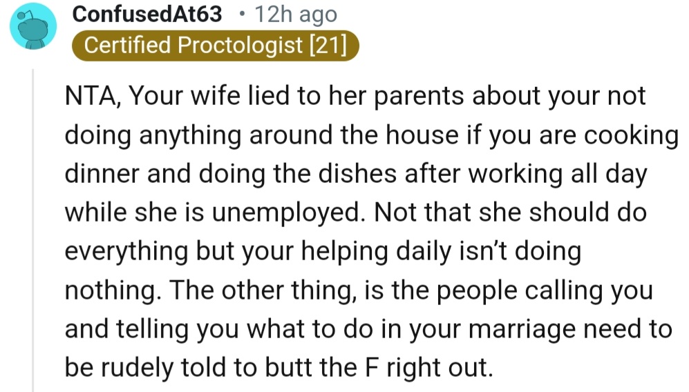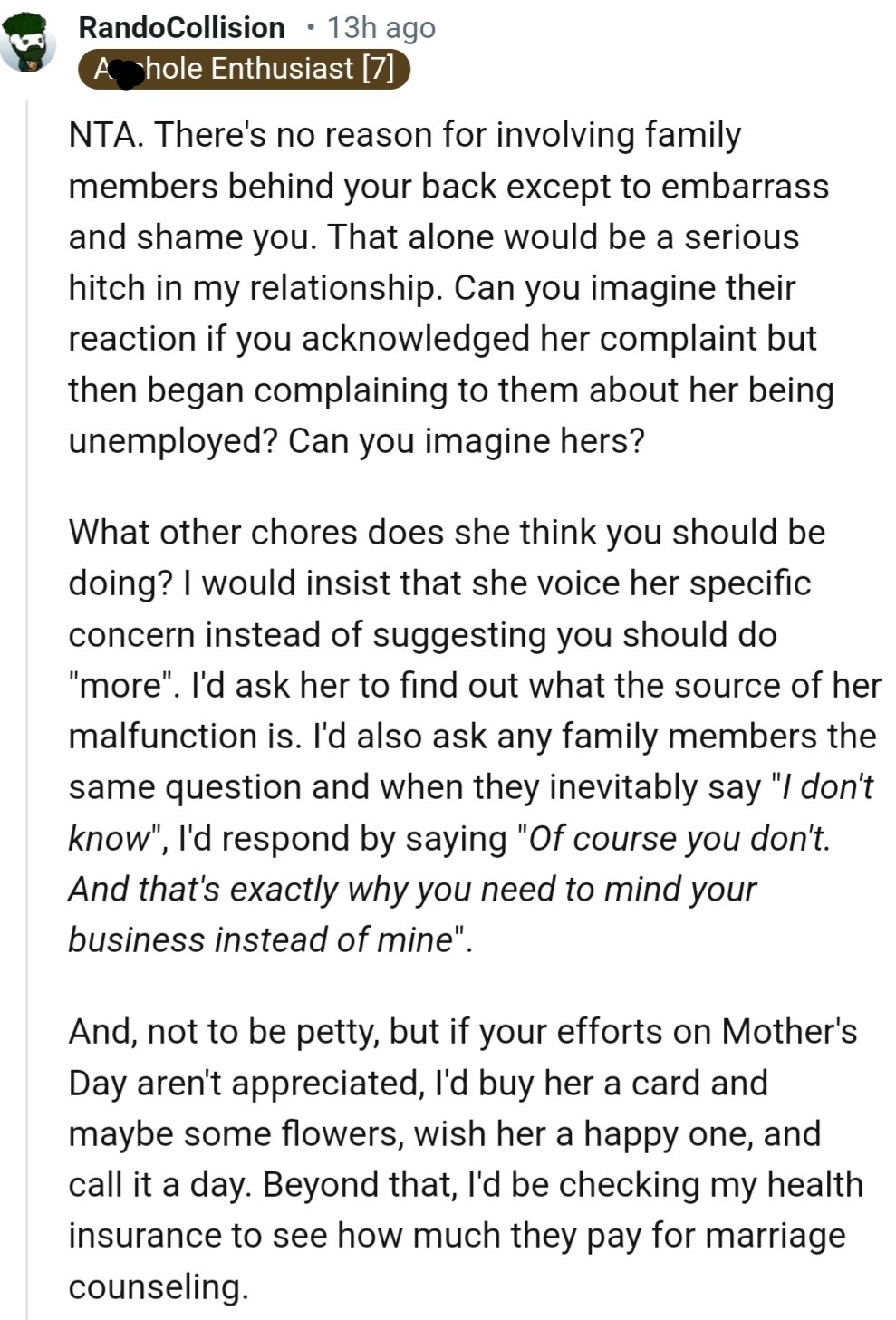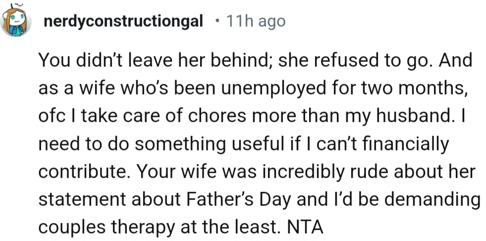 For context, OP’s wife was currently unemployed and handled most of the childcare while he worked. However, he still did his fair share, like cooking dinner every night and helping with dishes and yard work.