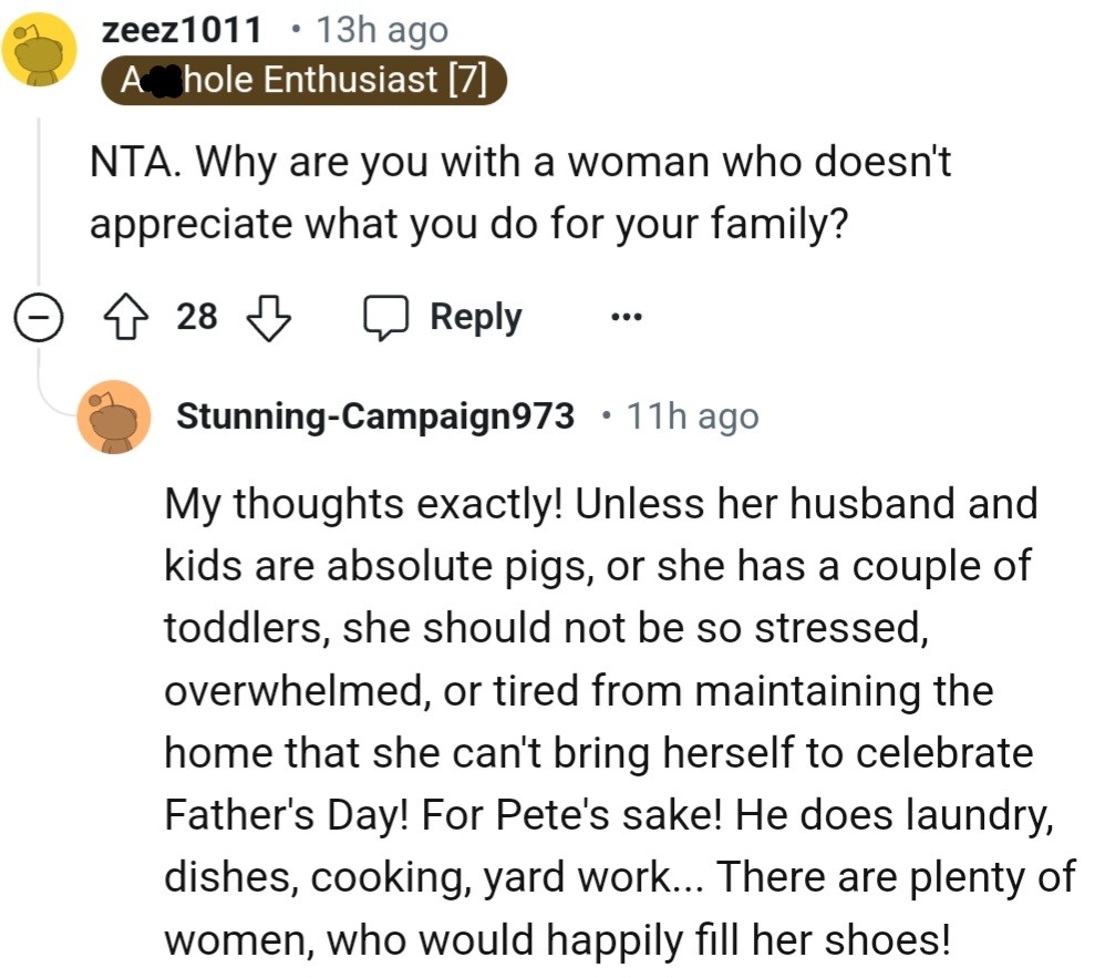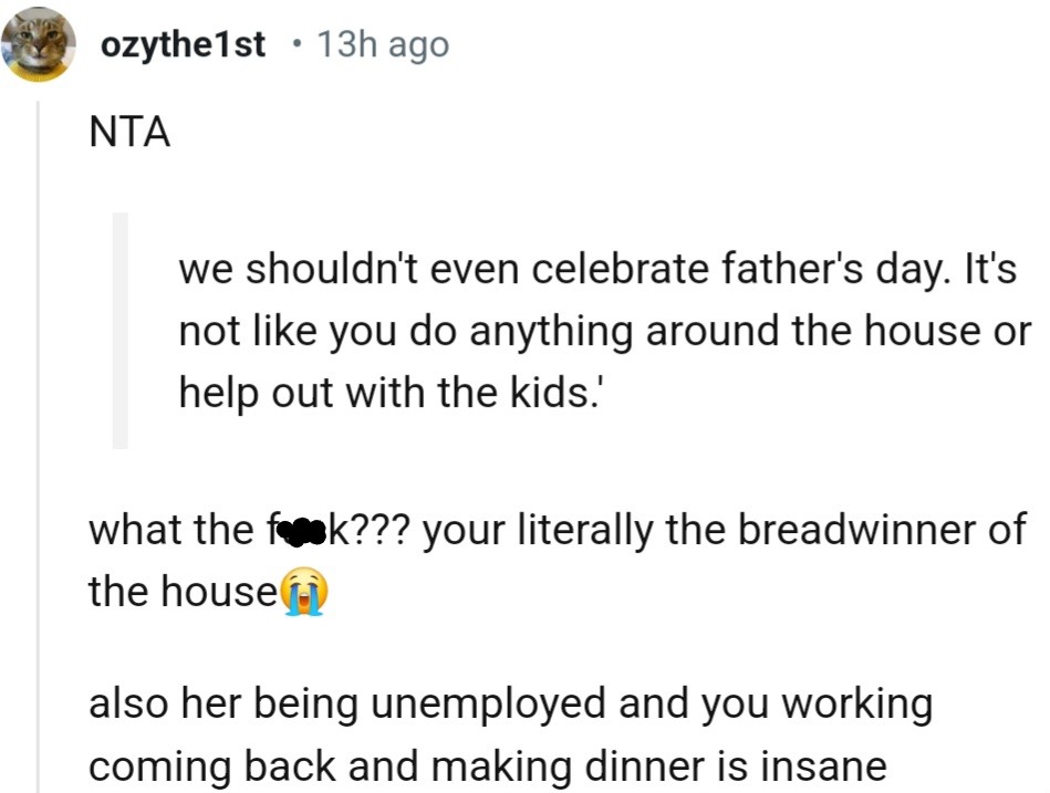 OP's wife ignored Father's Day, leaving him feeling unappreciated. She claimed he didn't help with the kids or household chores, despite him working and contributing to the family.