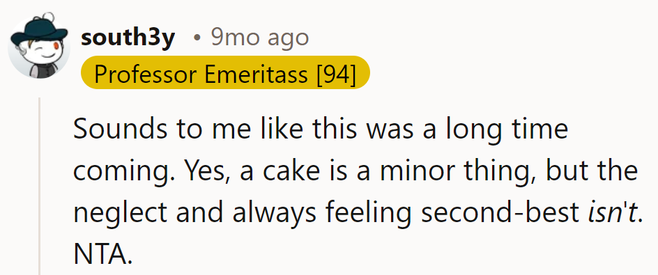 "Spot on! It's not just about the cake; it's about feeling perpetually sidelined."