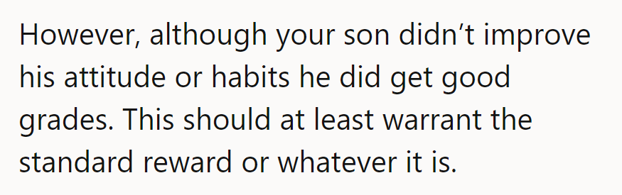 Husband suggests giving Ben the reward for his good grades, but OP insists he didn't improve, so he gets nothing.