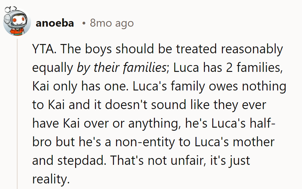 This dynamic often brings up the question of fairness, especially regarding how resources are allocated within the family. The stepmother's challenge is trying to make both children feel equally loved without the same financial means.