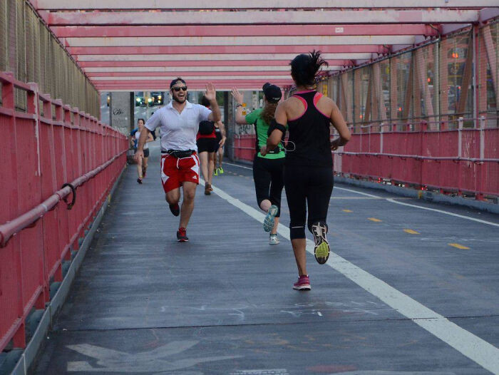 "This dude is high-fiving strangers on the Williamsburg Bridge. Edit: Just so we're clear, that's me".