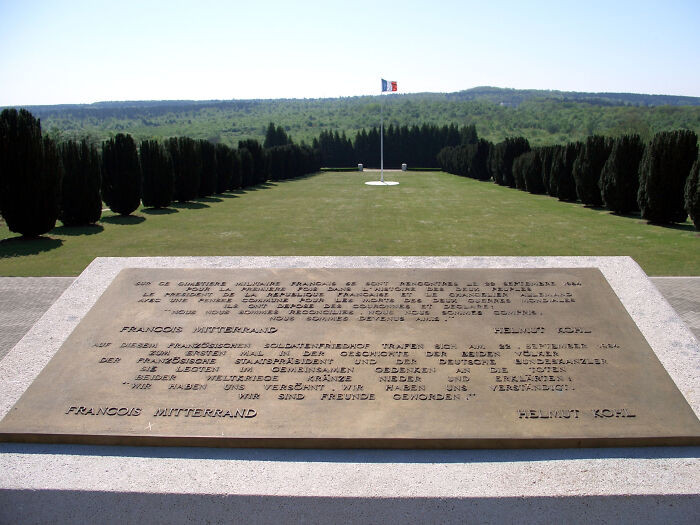 "On 22. In September 1984, the French president and the German chancellor met for the first time in this French national cemetery. In joint remembrance of the fallen soldiers of both world wars, they laid wreaths and declared: "We have found reconciliation, we have found our common values, we have become friends".