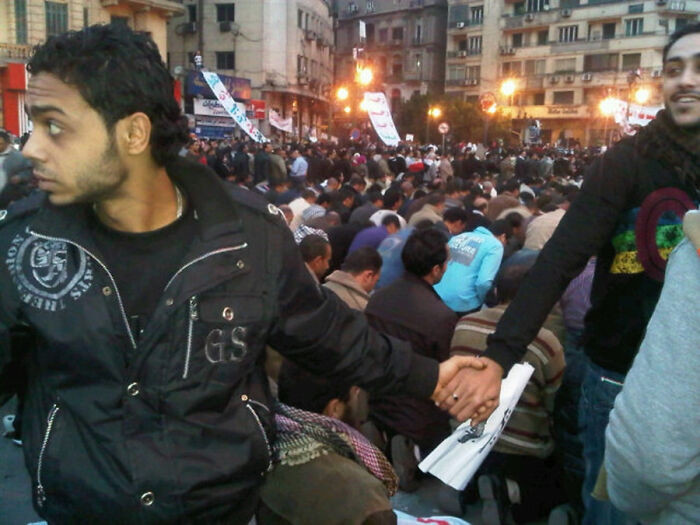 "Christians protecting Muslims while they pray during protests in Egypt "