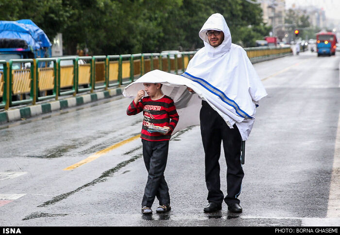 "This traffic policeman in Iran is covering a street sales boy from the rain."