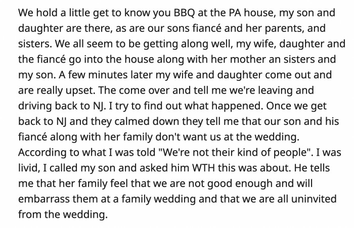 Apparently, OP, his wife, and his daughter were not invited to his son's wedding. His son, his fiancé, and her family said OP's family were not "their kind of people."