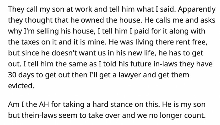 That was the final straw as OP told them they had 30 days to leave his home. He told them to inform his son that he was selling the house and he could find another place to live with the parasitic family.