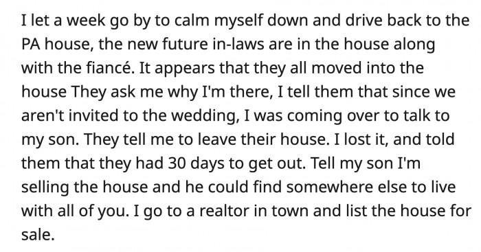 After uninviting his parents from his wedding, he thought he could just keep on living in their house rent-free