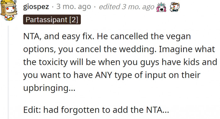 When the fiancé cancels vegan options, it not only undermines the bride's preferences but also disrespects her values.