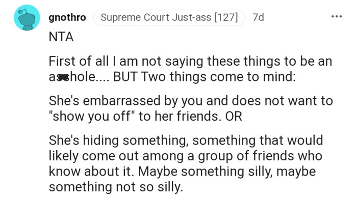 "There is much more going on and it either has to do with someone cheating or her friends dislike you"