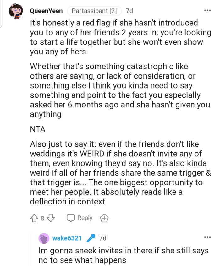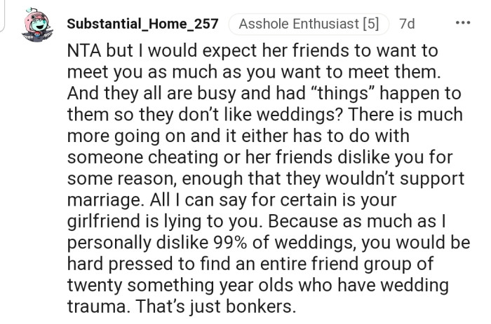 OP had even raised the idea of inviting her friends to their upcoming wedding, hoping to share that special day with everyone dear to them. However, she claimed her friends disliked weddings due to past experiences, which further deepened the mystery.