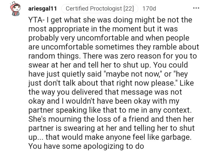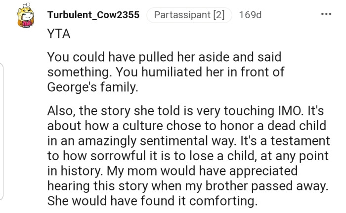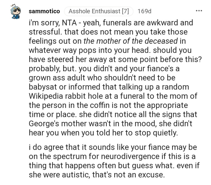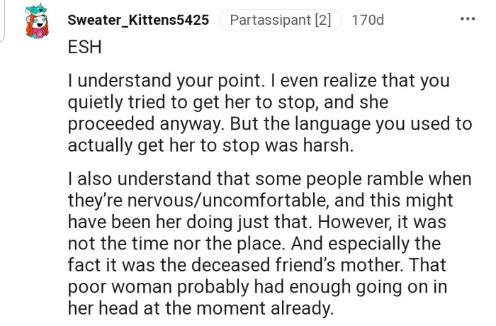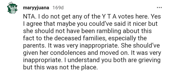 "Maybe you could’ve said it nicer, but she should not have been rambling about this fact to the deceased's family"